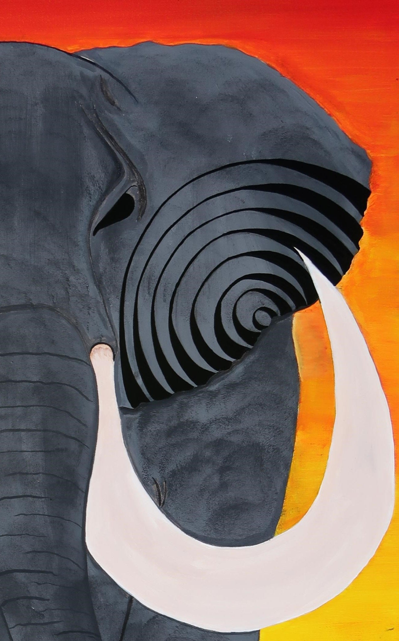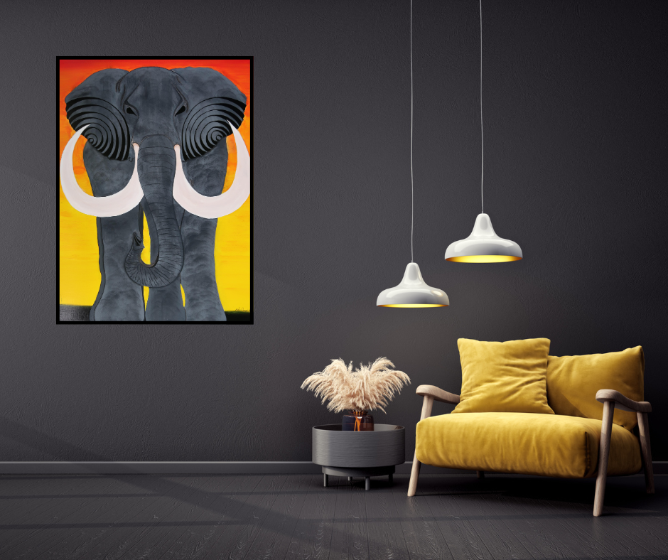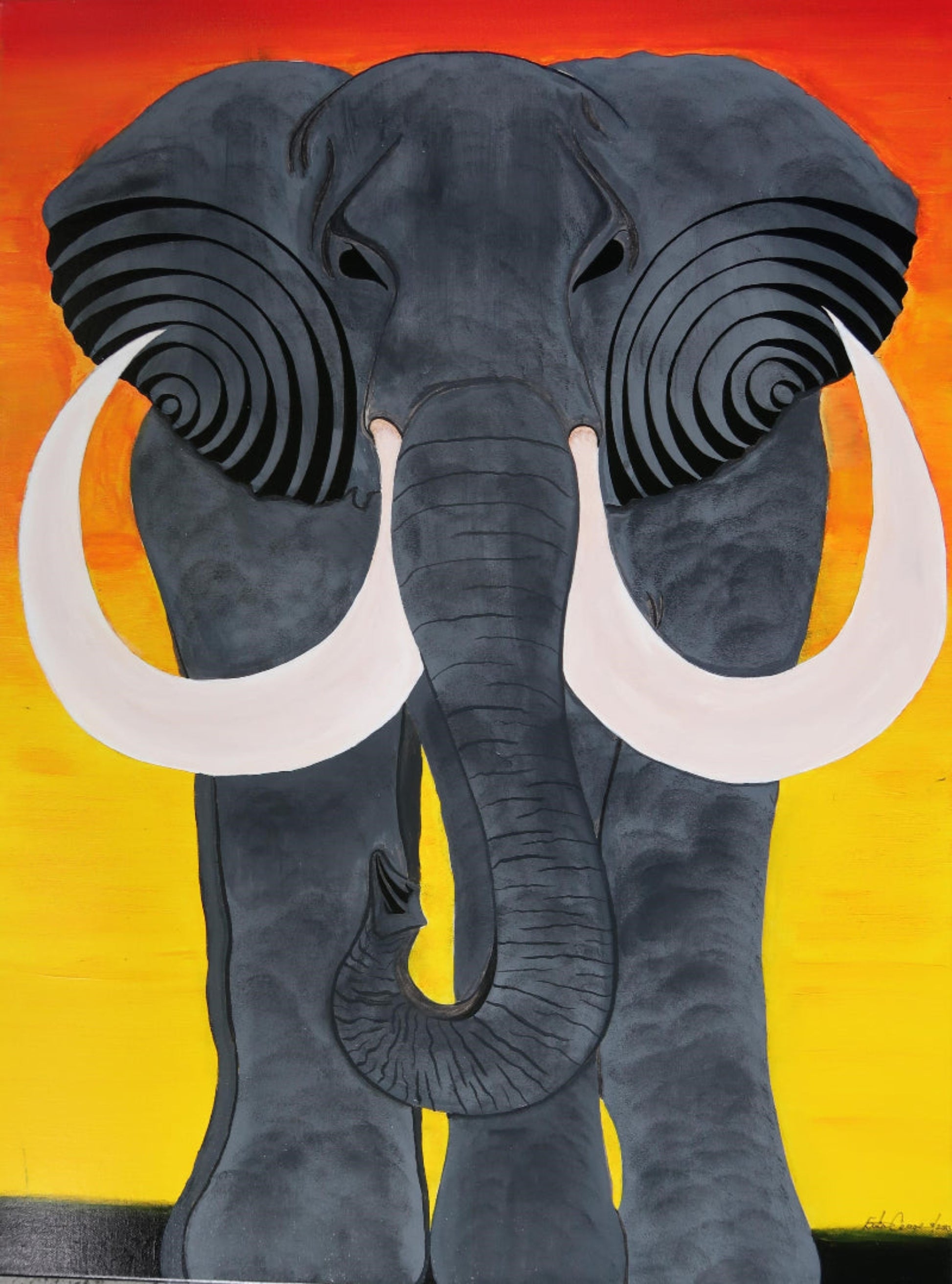 “Majestic Wisdom” is a bold "30x 40", abstract elephant painted in rich charcoal grey with sculptural eggshell white tusks and stylized, spiral-patterned ears—set against a powerful gradient sunset of deep orange and golden yellow.